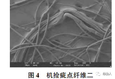 收集滌綸纖維機撿疵點,掃描電鏡照片如圖3、 圖4。