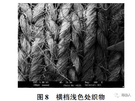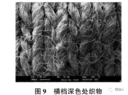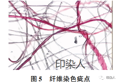 圖5所示,纖維染色疵點直徑是正常絲直徑的數倍。這種未經拉伸或拉伸不完全的纖維疵點、取向、結晶很低,染料分子很容易進入疵點纖維內部而得色深。由于纖維染色疵點質量較輕,在清棉工序難以去除,梳棉時不易梳理成單纖維狀態,易和其他纖維纏結在一起,蓋板花難以清除干凈,絡筒工序電清不能完全清除,織物經染色后,以深色疵點顯現在織物表面。