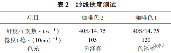 ④ 控制紗線捻度差異,減少色差風險。捻度級差主要是細紗、捻線工序錠速差異導致。當捻度差異大于4.5% ,色差風險增加。表2為紗線捻度差異導致的咖啡色針織物染色色差。由于紗線的色澤與纖維對光線的反射有關,而纖維對光線的反射又因紗線捻回角的不同而產生差異。