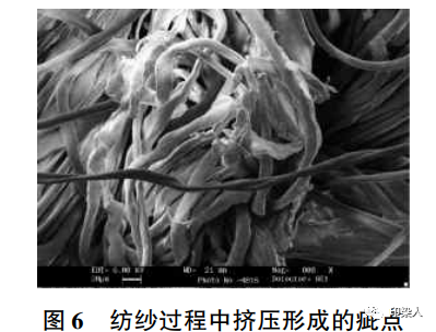 ② 清棉、梳棉工序由于隔距配置不當,纖維在開松、梳理過程中轉移不好受擠壓而形成疵點。圖6為纖維在紡紗過程中擠壓形成的疵點,擠壓疵點染色 后,由于纖維致密,染料不易進入纖維內部得色較淺。