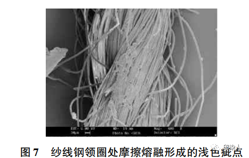 ③ 細紗、捻線工序由于鋼領、鋼絲圈選配不當或使用周期過長,由于細紗、捻線紡速較高,鋼絲圈線速度較大,鋼領和鋼絲圈瞬間會產生高溫,少量纖 維點會熔融,其熔點和結晶度較正常纖維高,導致染色困難,得色較正常纖維淺,特別是染敏感色更容易形成明顯的染色疵點。如圖7所示,在細紗工序 或捻線工序,鋼絲圈高速運轉,鋼領、鋼絲圈配合不好,瞬間產生高溫,致使纖維熔融,熔點升高,染色后表現為淺色疵點。