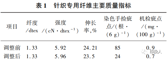 生產工藝進行優化調整后,機檢疵點含量、手撿疵點含量均顯著降低,較好地滿足了下游針織用戶的需求。表1為工藝優化前后儀化滌綸針織專用料主要質量指標。